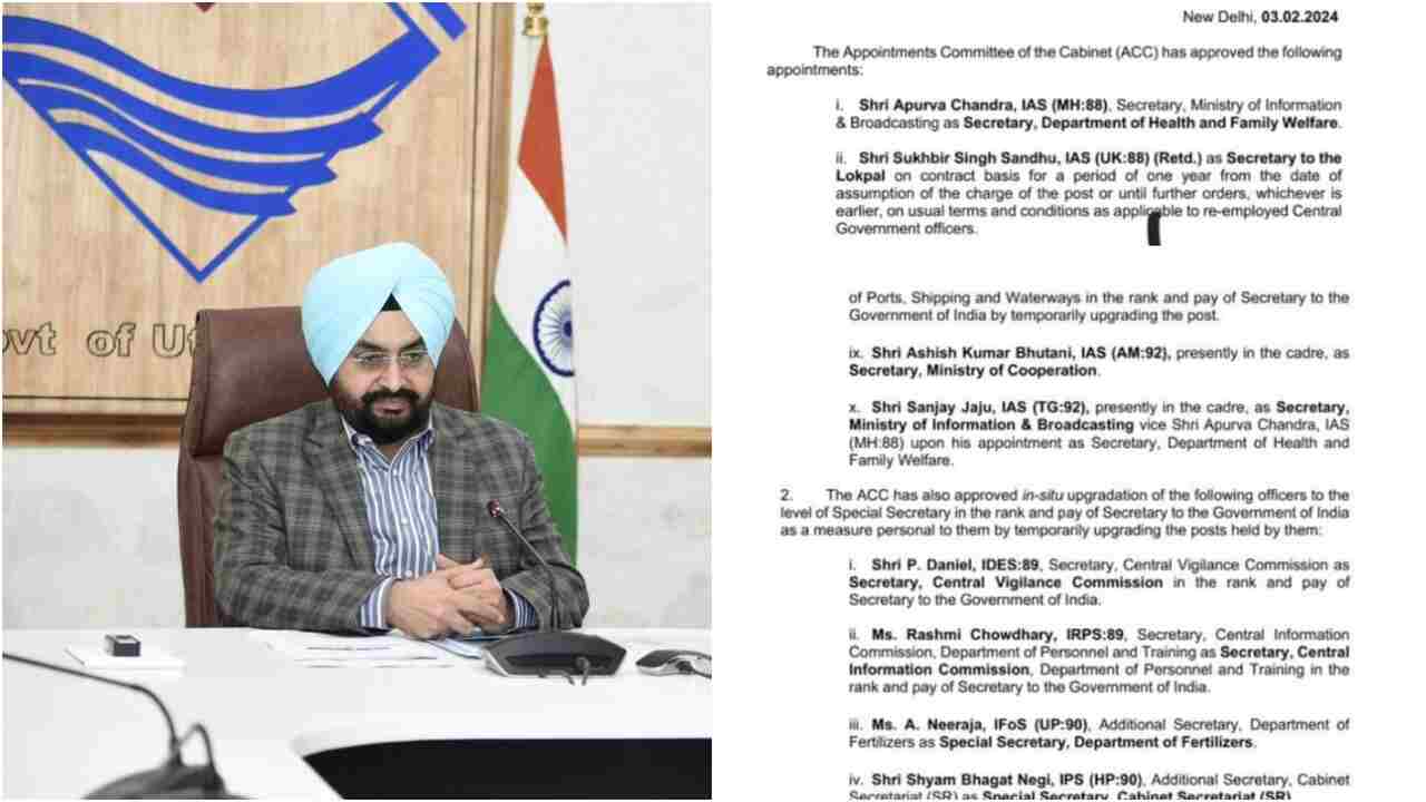 उत्तराखंड के पूर्व सीएस सुखबीर संधू को केंद्र ने दी बड़ी जिम्मेदारी, बनाया लोकपाल सचिव, आदेश जारी