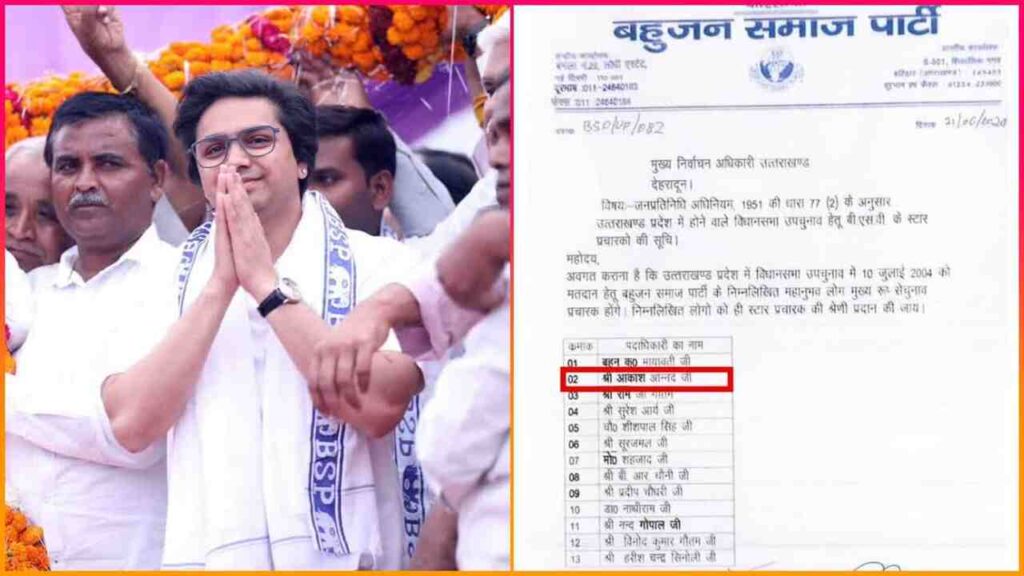 देहरादून: 10 जुलाई को उत्तराखंड की दो विधानसभा सीटों पर होने वाले उपचुनाव को लेकर बहुजन समाज पार्टी ने 13 स्टार प्रचारकों की सूची जारी की दी है. यहां गौर करने वाली ये है कि इस सूची में पार्टी की ओर से मायावती के भतीजे आकाश आनंद का नाम भी शामिल है. बता दें कि, आकाश आनंद को लोकसभा चुनाव के दौरान पार्टी के सभी पदों से हटा दिया गया था.