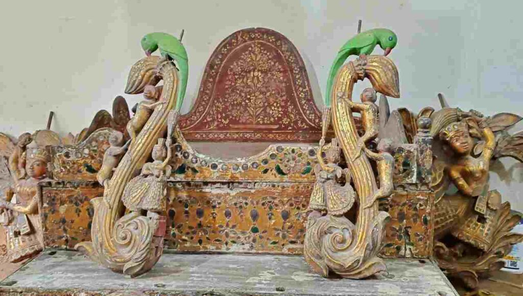 सहारनपुर: यूपी के सहारनपुर में वृंदावन से एक झूला रिपेयरिंग के लिए आया है. यह वृंदावन के सीताराम जी मंदिर का झूला है, जो करीबन 200 साल पुराना है. झूला देखकर लग रहा है कि ये काफी जर्जर हो गया है, जिसकी वजह से इसकी सुंदरता भी कम हो गई है. झूले पर बने कांच की डिजाइन और पॉलिश भी काफी खराब हो चुकी है. इसीलिए वृंदावन से सीताराम जी का झूला सहारनपुर लाया गया है, ताकि इसको फिर से एक अच्छा लुक देते हुए इसकी सुंदरता बढ़ाई जा सके.
