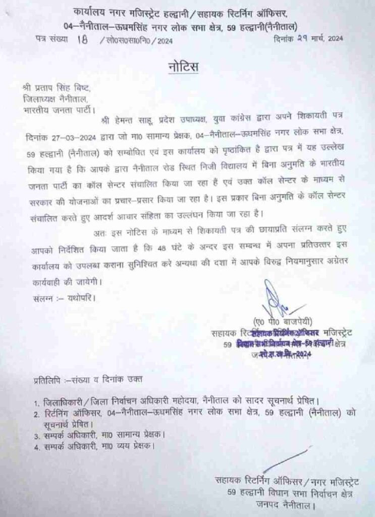 हल्द्वानी निवासी युवा कांग्रेस के प्रदेश उपाध्यक्ष हेमंत साहू ने बीती 27 मार्च को चुनाव आयोग से लिखित शिकायत कर कहा था कि नैनीताल रोड के एक निजी स्कूल में बिना अनुमति के भाजपा का कॉल सेंटर संचालित किया जा रहा है. जिसके माध्यम से लोगों के मोबाइलों पर मैसेज और फोन के माध्यम से सरकार की योजनाओं का प्रचार-प्रसार किया जा रहा है. हेमंत साहू ने इसे आचार संहिता का उल्लंघन मानते हुए इसकी शिकायत निर्वाचन आयोग को की थी.