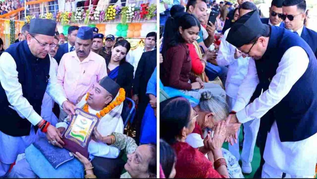 देहरादून : मुख्यमंत्री पुष्कर सिंह धामी ने शनिवार को देहरादून स्थित शहीद स्थल कचहरी परिसर में उत्तराखंड राज्य आंदोलनकारी शहीदों को पुष्पांजलि अर्पित कर उन्हें श्रद्धांजलि दी। इसी क्रम मेंउत्तराखंड राज्य स्थापना के रजत जयंती वर्ष के अवसर पर उन्होंने पुलिस लाइन में आयोजित राज्य आंदोलनकारी सम्मान समारोह में राज्य आंदोलनकारियों और बलिदानी राज्य आंदोलनकारियों के परिवारजनों को सम्मानित किया। कचहरी परिसर शहीद स्थल और पुलिस लाइन देहरादून में इस अवसर पर राज्य आंदोलनकारियों पर हेलीकाप्टर से पुष्प वर्षा भी की गई ।