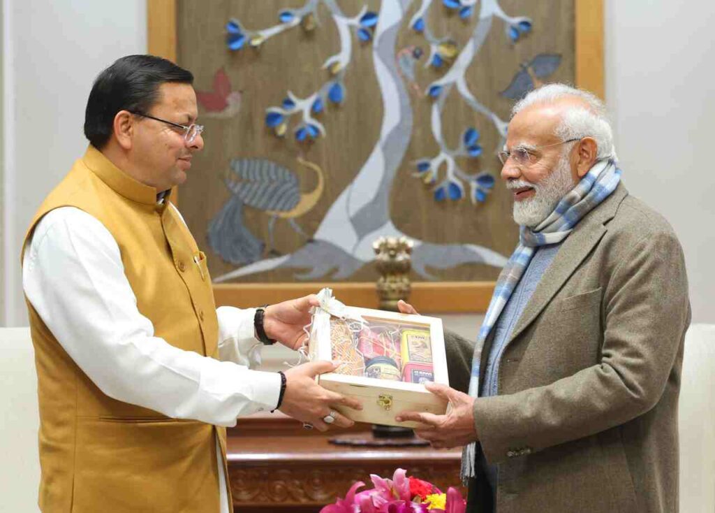 नई दिल्ली: सीएम पुष्कर सिंह धामी इन दिनों दिल्ली के दौरे पर हैं। गुरुवार को सीएम ने पीएम मोदी से मुलाकात की। इस दौरान उन्होंने पीएम को बागेश्वर के प्रसिद्ध ताम्र शिल्प पर आधारित उत्पाद भेंट किए। साथ ही ग्लोबल इन्वेस्टर्स समिट–2023 के दौरान निवेश की ग्राउंडिंग के लिए किए जा रहे विभिन्न कार्यों की विस्तृत जानकारी दी। वहीं, सहकारिता से जुड़े सभी सदस्यों के परिवारों की आकस्मिक दुर्घटना की स्थिति में सुरक्षा के दृष्टिगत सहकारी किसान समृद्धि कार्ड योजना (नमो सहकारी कवच कार्ड) प्रारंभ करने के विषय में आदरणीय प्रधानमंत्री जी को अवगत कराया।