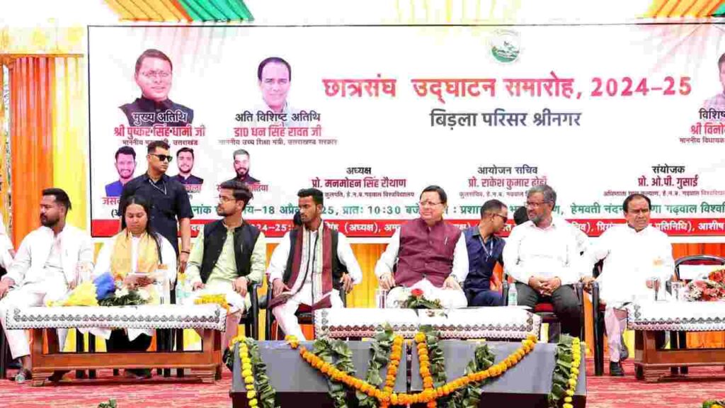 श्रीनगर गढ़वाल: मुख्यमंत्री पुष्कर सिंह धामी ने हेमवती नंदन बहुगुणा गढ़वाल केंद्रीय विश्वविद्यालय श्रीनगर में छात्रसंघ उद्घाटन समारोह 2024-25 में मुख्य अतिथि के रूप में प्रतिभाग किया. इस मौके पर सीएम धामी ने कहा कि राज्य सरकार विश्वविद्यालय के सर्वांगीण विकास के लिए पूरी तरह से प्रतिबद्ध है. युवाओं को सशक्त बनाने के लिए शिक्षा, रोजगार, स्वास्थ्य और आधारभूत संरचना जैसे क्षेत्रों में व्यापक कार्य कर रही है.
