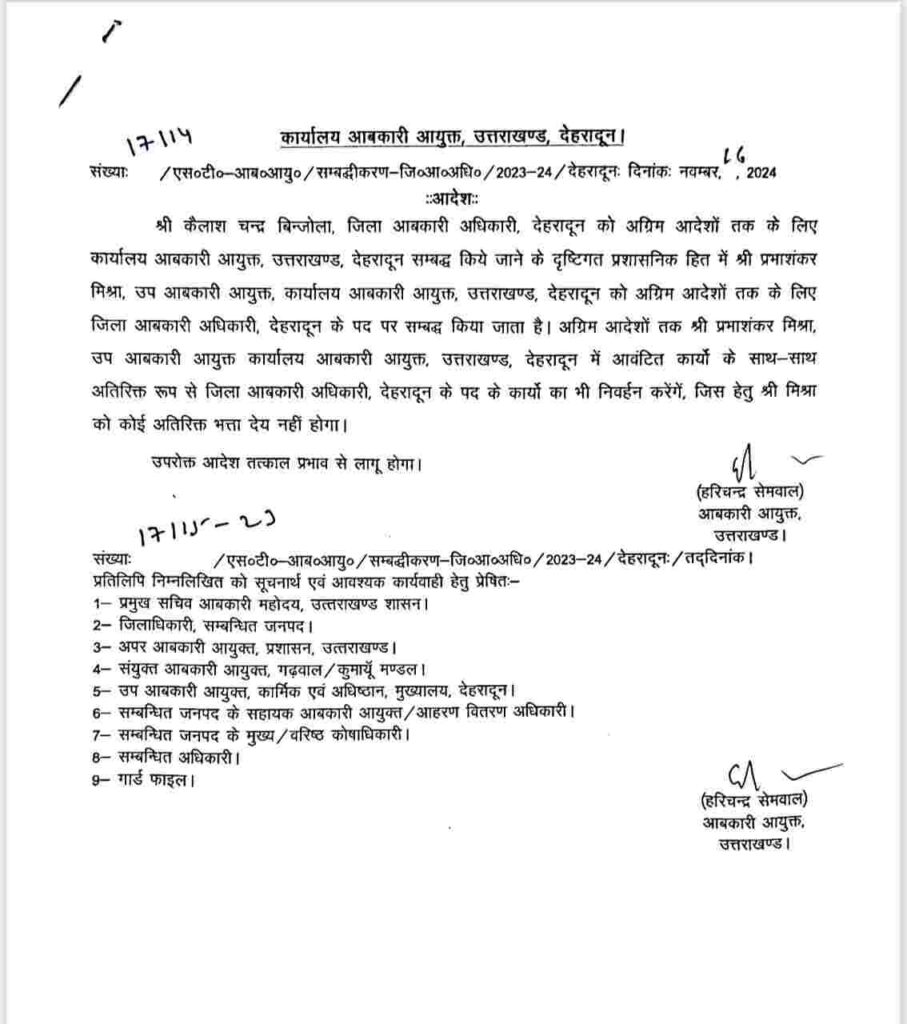आबकारी आयुक्त हरिश्चंद्र सेमवाल ने इस संदर्भ में आदेश जारी करते हुए कैलाश चंद्र बिंजोला को अग्रिम आदेशों तक आबकारी आयुक्त कार्यालय में संबद्ध किया है. फिलहाल जिला आबकारी अधिकारी के तौर पर प्रभाशंकर मिश्रा को अतिरिक्त जिम्मेदारी दे दी गई है. प्रभा शंकर मिश्रा उप आबकारी आयुक्त के तौर पर आबकारी मुख्यालय में काम देख रहे हैं. ऐसे में अब उन्हें जिला आबकारी अधिकारी के पद पर नए आदेश होने तक इसकी जिम्मेदारी सौंपी गई है.