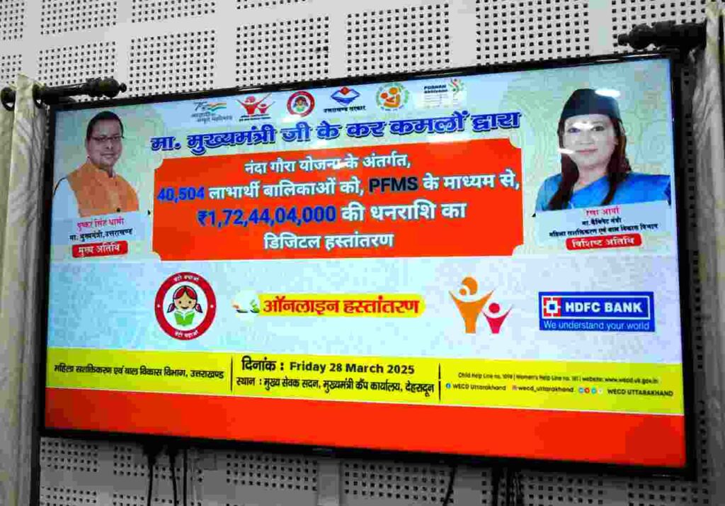 देहरादून: मुख्यमंत्री पुष्कर सिंह धामी ने शुक्रवार को मुख्यमंत्री कैंप कार्यालय से डीबीटी के माध्यम से नंदा गौरा योजना के 40 हजार 504 लाभार्थियों को वित्तीय वर्ष 2024-25 में लाभान्वित 01 अरब 72 करोड़ 44 लाख 04 हजार रुपए की धनराशि का वितरण किया। इस योजना के माध्यम से विगत 05 वर्ष में 02 लाख 84 हजार 559 लाभार्थियों को कुल 09 अरब 68 करोड़ 64 लाख 51 हजार की धनराशि डीबीटी के माध्यम से प्रदान की गई।