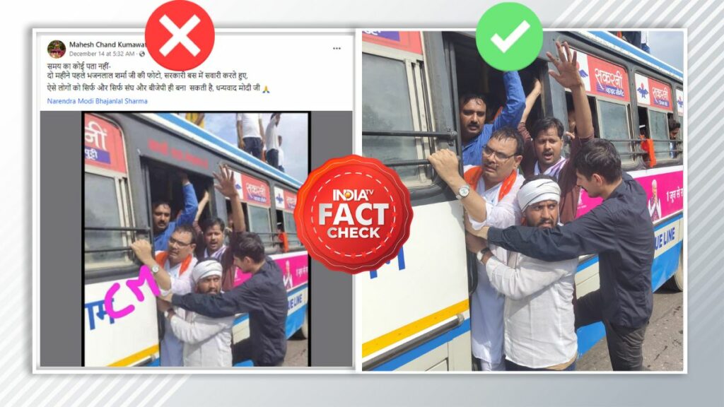 दरअसल, सोशल मीडिया प्लेटफॉर्म फेसबुक पर Mahesh Chand Kumawat नाम के एक यूजर ने 14 दिसंबर को ये फोटो पोस्ट की है। इस तस्वीर के साथ कैप्शन में लिखा है, “समय का कोई पता नहीं- दो महीने पहले भजनलाल शर्मा जी की फोटो, सरकारी बस में सवारी करते हुए, ऐसे लोगों को सिर्फ और सिर्फ संघ और बीजेपी ही बना सकती है, धन्यवाद मोदी जी”