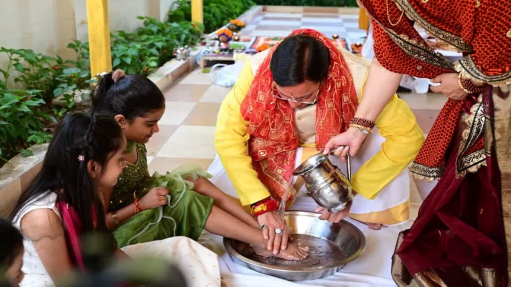 दुर्गा अष्टमी पर कन्या पूजन, मुख्यमंत्री पुष्कर सिंह धामी ने कन्याओं के चरण छूकर लिया आशीर्वाद