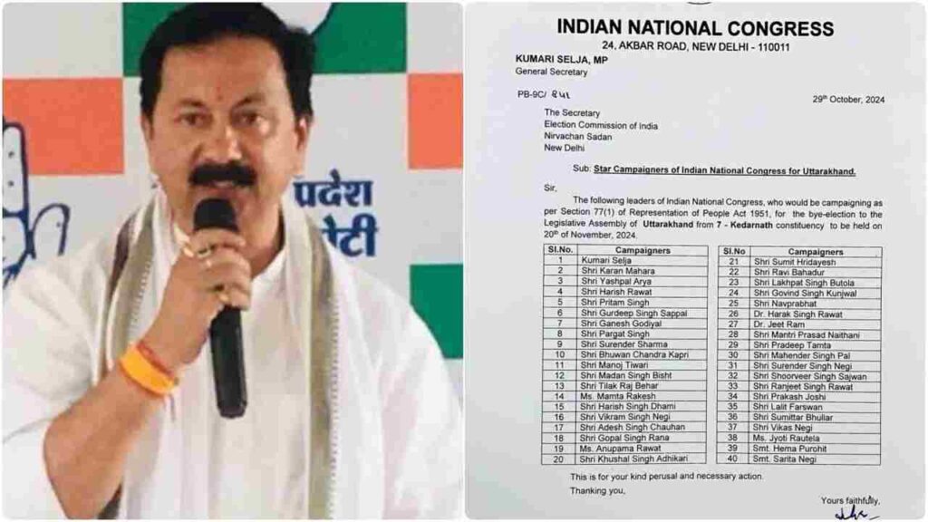 इस सूची में 40 कांग्रेस के नेताओं को स्टार प्रचारक बनाया गया है. इनमें कांग्रेस पार्टी की उत्तराखंड प्रभारी कुमारी शैलजा, पार्टी के प्रदेश अध्यक्ष करन माहरा , नेता प्रतिपक्ष यशपाल आर्य ,पूर्व मुख्यमंत्री हरीश रावत, पूर्व प्रदेश अध्यक्ष प्रीतम सिंह, उप नेता प्रतिपक्ष भुवन कापड़ी, केंद्रीय नेता गुरदीप सिंह सप्पल, पूर्व प्रदेश अध्यक्ष गणेश गोदयाल, सह प्रभारी प्रगट सिंह और सुरेंद्र शर्मा को स्टार प्रचारकों की सूची में शामिल किया गया है. सूची में 40 नाम निर्धारित किए गए हैं.
