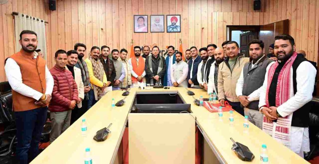 देहरादून: देहरादून में मुख्यमंत्री पुष्कर सिंह धामी से मुख्यमंत्री आवास में भारतीय जनता युवा मोर्चा के नवनियुक्त जिलाध्यक्षों ने शिष्टाचार भेंट कर उनका मार्गदर्शन प्राप्त किया…इस अवसर पर मुख्यमंत्री ने सभी नवदायित्व प्राप्त युवा पदाधिकारियों को शुभकामनाएं दीं…और संगठनात्मक कार्यों, राष्ट्रसेवा तथा जनहित के प्रति पूरी निष्ठा से कार्य करने का आह्वान किया…मुख्यमंत्री ने कहा कि…युवा मोर्चा भारतीय जनता पार्टी की वैचारिक रीढ़ है…और संगठन को जमीनी स्तर पर सशक्त बनाने में युवाओं की भूमिका अत्यंत महत्वपूर्ण है…उन्होंने कहा कि…आज का युवा ही विकसित उत्तराखंड और सशक्त भारत का निर्माता है।