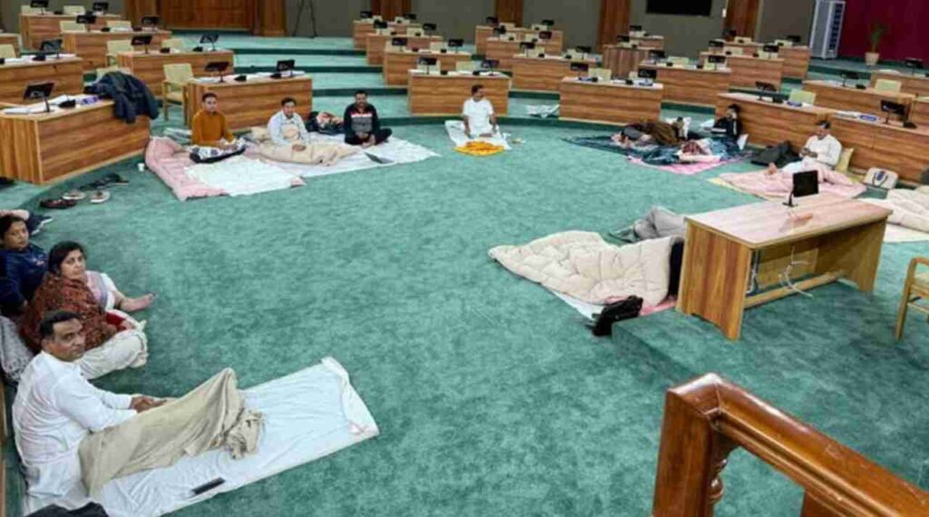 गैरसैण: दिनभर भारी विरोध के बाद विपक्ष ने मानसून सत्र की पहली रात सदन के अंदर गुजारी। नेता प्रतिपक्ष यशपाल आर्य से लेकर सभी कांग्रेसी विधायक कंबल ओढ़कर बैठे नजर आए।