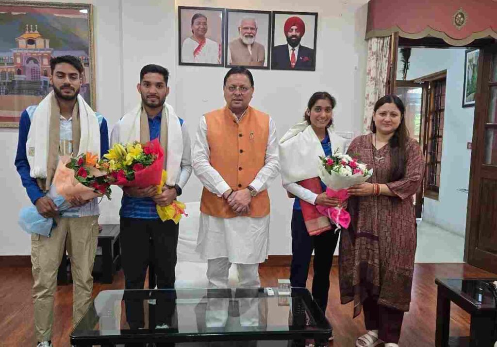 देहरादून: मुख्यमंत्री पुष्कर सिंह धामी से पेरिस ओलिंपिक में प्रतिभाग कर लौटे खिलाड़ियों अंकिता ध्यानी, परमजीत सिंह एवं सूरज पंवार ने भेंट की। मुख्यमंत्री ने पेरिस ओलंपिक में प्रतिभाग पर तीनों खिलाड़ियों को बधाई देते हुए उन्हें सम्मानित किया। मुख्यमंत्री ने उनके उज्ज्वल भविष्य की कामना की। सूरज पंवार ने 42 किमी रेस वॉक मिक्स्ड रिले, परमजीत सिंह ने 20 किमी रेस वॉक एवं अंकिता ध्यानी ने 5000 मीटर में प्रतिभाग किया। मुख्यमंत्री ने तीनों को शुभकामनाएं दी हैं