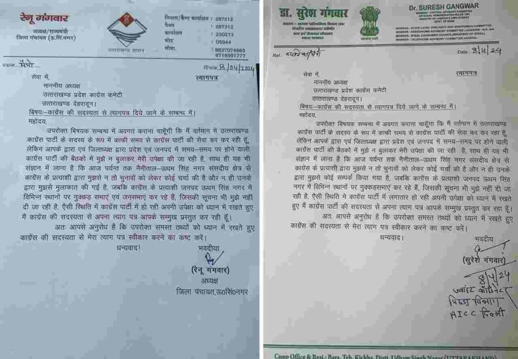 गंगवार दंपति ने कांग्रेस प्रदेश अध्यक्ष करण माहरा को अपना इस्तीफा भेज दिया है. गंगवार दंपति ने कांग्रेस में अपनी उपेक्षा का आरोप लगाया है. बता दें कि उत्तराखंड विधानसभा चुनाव 2022 में गंगवार दंपति ने बीजेपी का दामन छोड़कर कांग्रेस का हाथ थामा था, लेकिन दो साल के अंदर की गंगवार दंपति ने फिर से पलटी मारी और कांग्रेस से इस्तीफा दे दिया. कयास लगाए जा रहे है कि गंगवार दंपति जल्द ही बीजेपी में शामिल हो सकते है.