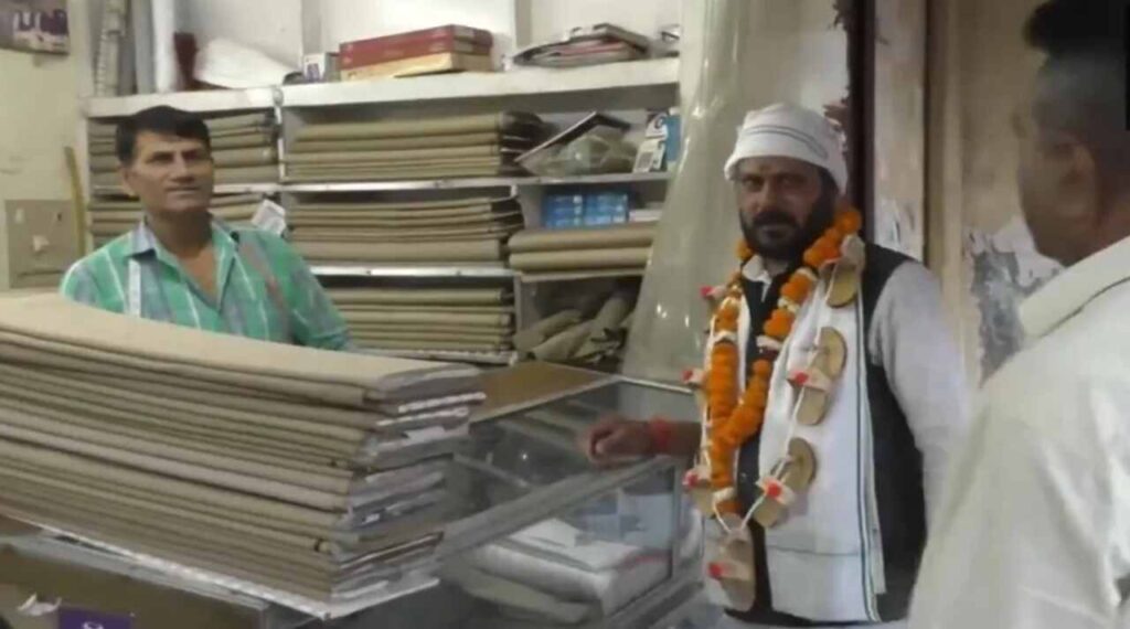#WATCH | Aligarh, UP: Independent candidate from Aligarh Pandit Keshav Dev has been allotted 'slippers' as the election symbol. After which, he was seen carrying out the election campaign wearing a garland of 7 slippers around his neck. (08.04) pic.twitter.com/V0Hm8JYRmC