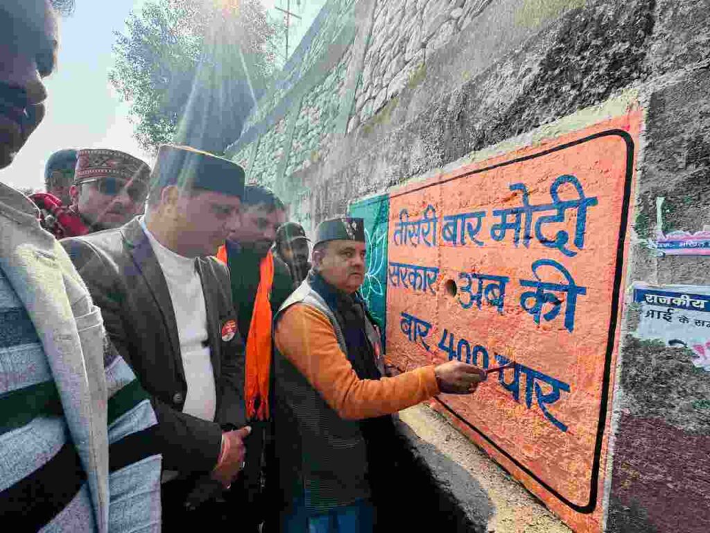 देहरादून/उत्तरकाशी: भाजपा ने ‘अब की बार 400 पार’ के संदेश के साथ लोकसभा चुनाव को लेकर आज उत्तरकाशी के चिन्यालीसौड से दीवार लेखन अभियान का गणेश कर दिया है।  बूथ स्तर पर चलने वाले इस अभियान की शुरुआत करते हुए प्रदेश अध्यक्ष महेंद्र भट्ट ने कहा, इसमें दीवार पर लिखा जाने वाला प्रत्येक वाक्य हमारी प्रतिबद्धता और संकल्प का प्रतीक है । वहीं विकसित भारत संकल्प यात्रा में सहभागिता कर उन्होंने लाभार्थियों के अनुभव सुनते हुए योजना सम्बंधी चेक एवं प्रमाणपत्र भी वितरित किए ।