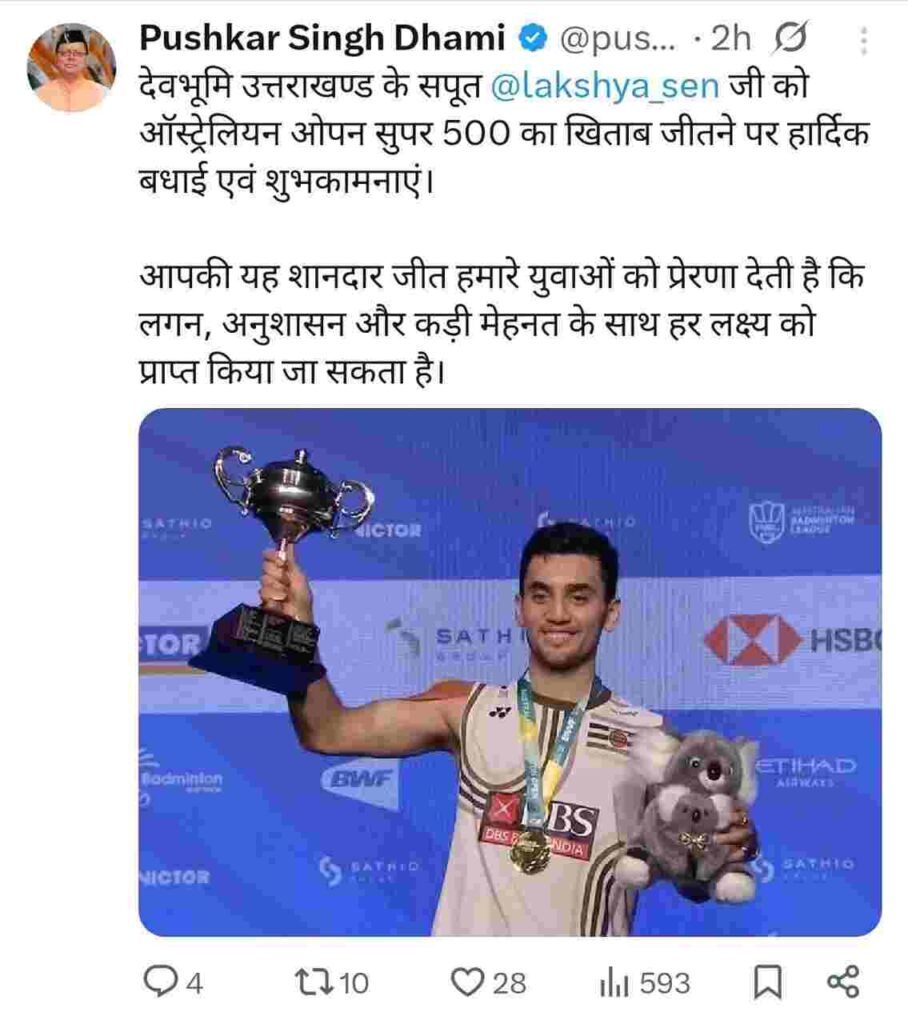 मुख्यमंत्री ने कहा कि लक्ष्य सेन की यह शानदार उपलब्धि उत्तराखण्ड ही नहीं, सम्पूर्ण देश के लिए गर्व का विषय है। उन्होंने कहा कि लक्ष्य की मेहनत, समर्पण और निरंतर उत्कृष्ट प्रदर्शन हमारे सभी युवाओं के लिए प्रेरणास्रोत है और यह साबित करता है कि लगन, अनुशासन और कड़ी मेहनत के साथ हर कठिन लक्ष्य को प्राप्त किया जा सकता है।