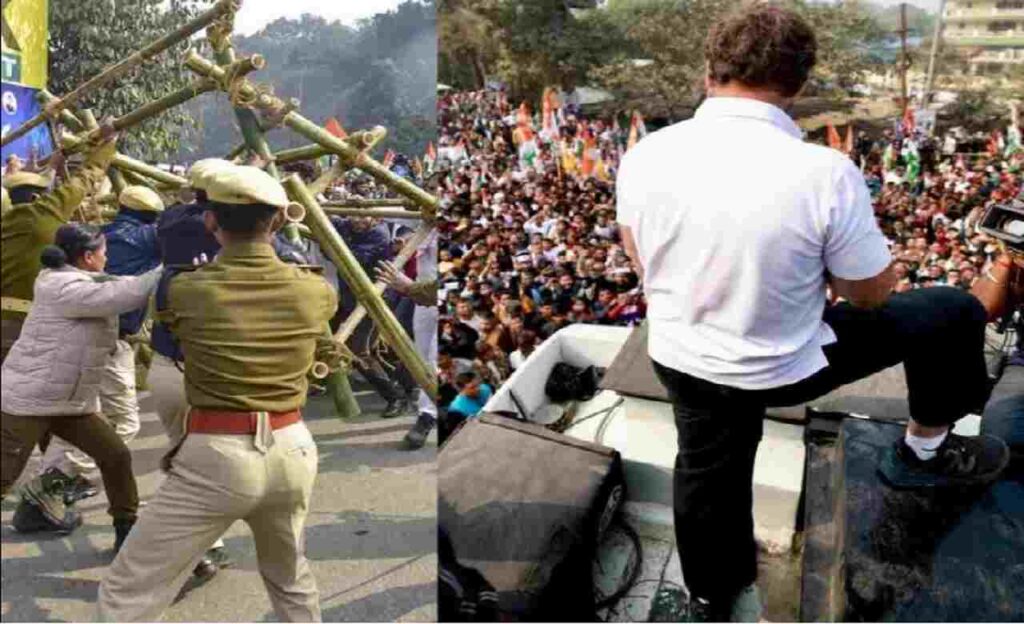 गुवाहाटी: कांग्रेस के पूर्व अध्यक्ष राहुल गांधी की अगुवाई वाली ‘भारत जोड़ो न्याय यात्रा’ को मंगलवार को गुवाहाटी में प्रवेश करने से रोक दिया गया। यात्रा को रोके जाने के बाद कांग्रेस के कार्यकर्ता उग्र हो गए और उन्होंने विरोध प्रदर्शन करते हुए वहां लगाए गए बैरिकेड्स को तोड़ दिया। कांग्रेस कार्यकर्ताओं ने विरोध प्रदर्शन के दौरान जमकर नारेबाजी भी की। कांग्रेस समर्थकों को आगे बढ़ने से रोकने के लिए पुलिस को बल प्रयोग करना पड़ा। मुख्यमंत्री हिमंत विश्व शर्मा ने बवाल होने के बाद गुवाहाटी में ट्रैफिक जाम का आरोप लगाते हुए राहुल गांधी पर FIR दर्ज करने का आदेश दिया है।