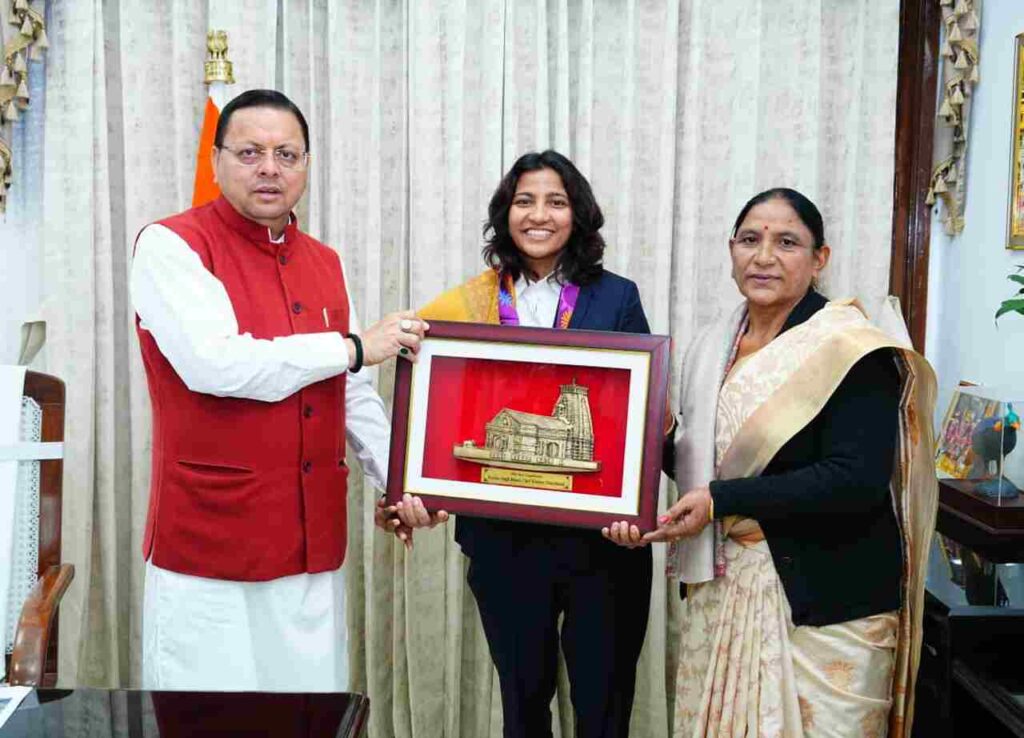 देहरादून: मुख्यमंत्री पुष्कर सिंह धामी से मुख्यमंत्री आवास में महिला क्रिकेट विश्व कप विजेता टीम की सदस्य एवं उत्तराखंड की गौरव, क्रिकेटर स्नेह राणा ने शिष्टाचार भेंट की। इस अवसर पर विशेष प्रमुख सचिव खेल अमित सिन्हा भी उपस्थित रहे। मुख्यमंत्री धामी ने स्नेह राणा को भारतीय महिला क्रिकेट टीम की शानदार जीत पर हार्दिक बधाई देते हुए कहा कि यह उपलब्धि पूरे देश और उत्तराखंड के लिए गर्व का विषय है। उन्होंने कहा कि स्नेह राणा ने अपने उत्कृष्ट प्रदर्शन और संघर्षशीलता से देश और प्रदेश का नाम विश्व पटल पर रोशन किया है।